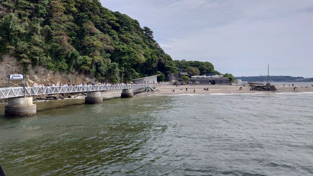横須賀の三笠桟橋から船で約10分。デッキからの景色は最高で、海風を浴びながら写真を撮るだけでも気分が上がります。船の上からは青い海(黒い)と横須賀の街並みが見えて楽しいです。